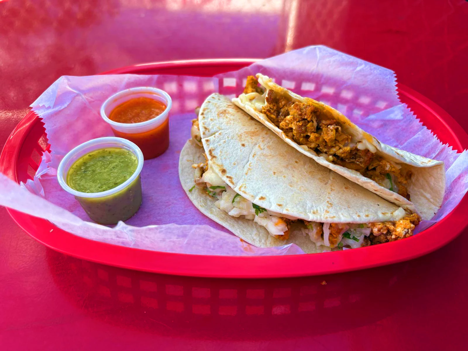 All breakfast tacos are served in 2 flour tortillas accompanied by garlic allioli.
