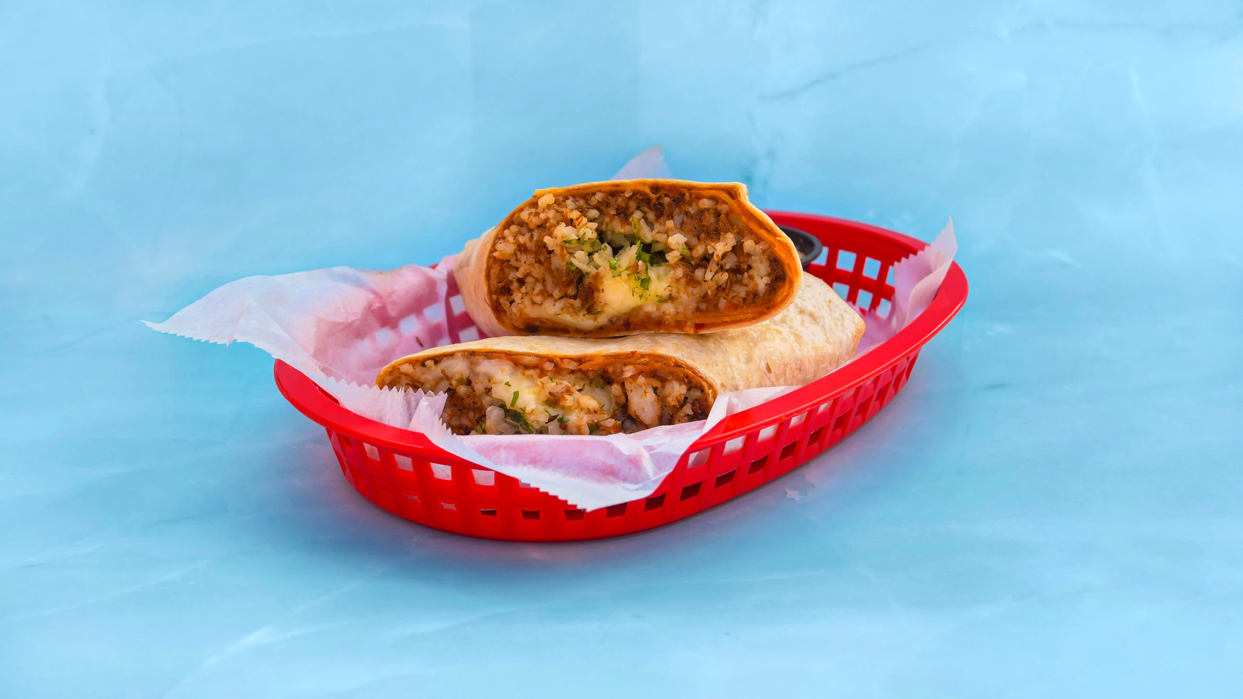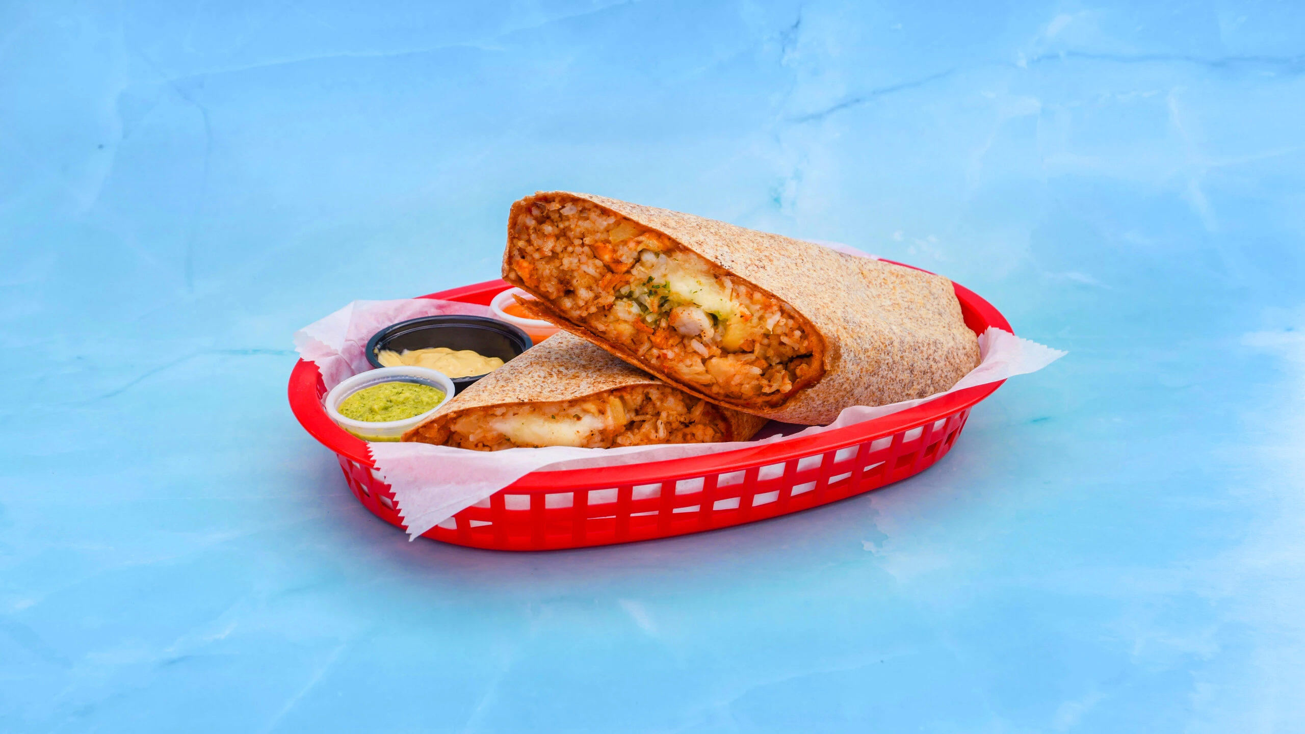 Chicken pastor burritos are served a large flour tortilla with mozzarella chese , white rice , refried pinto beans with chorizo , onion , and cilantro , accompanied by garlic aioli