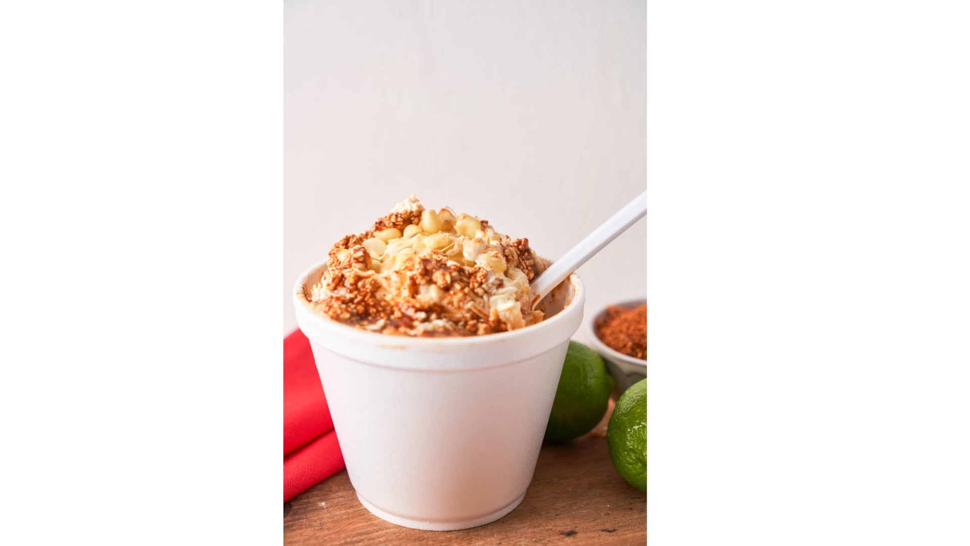 Sweet corn serverd in a cup with butter , cotija cheese, lime , mayonnaise and tagine