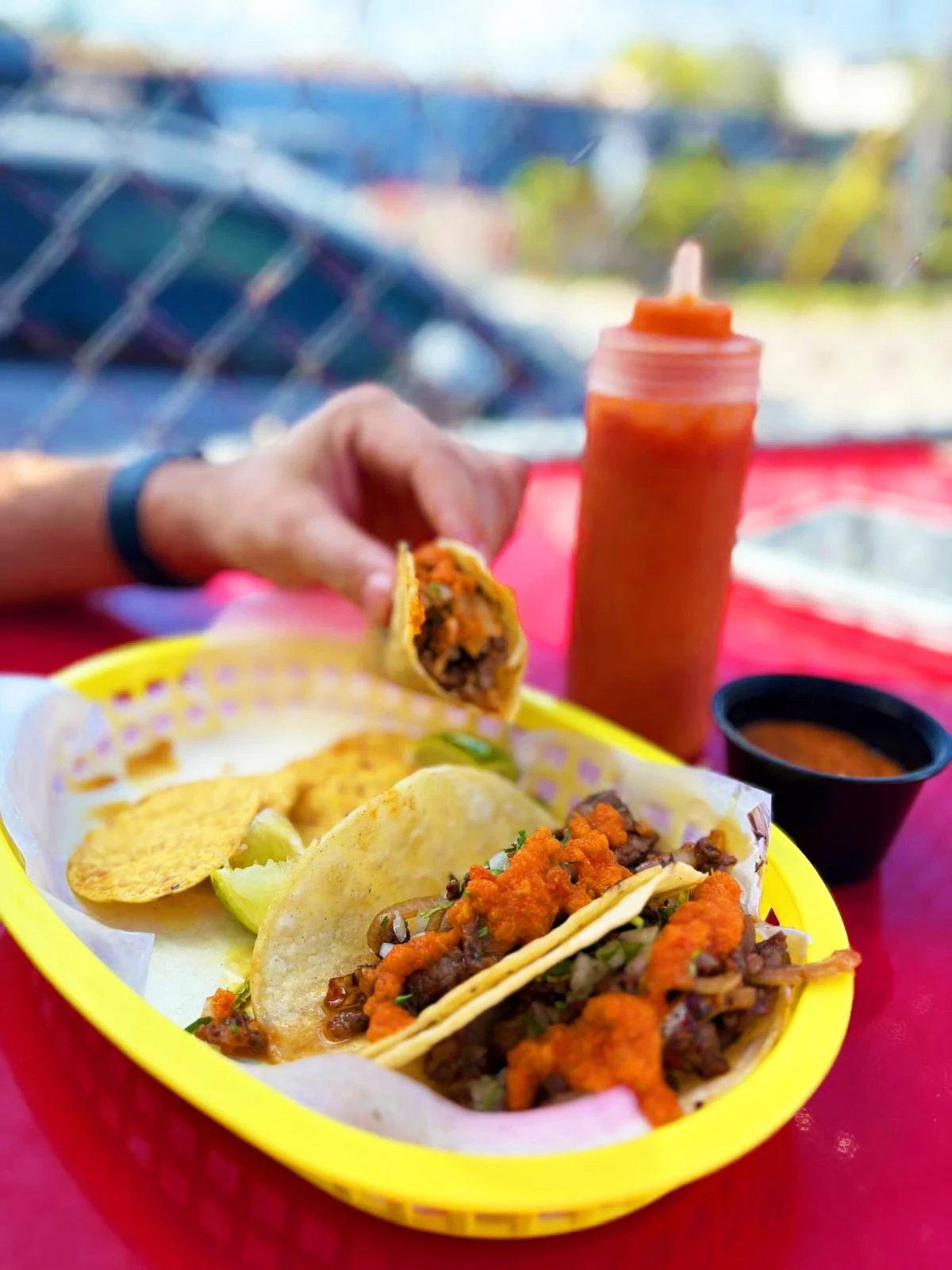3 tacos in corn tortilla or 2 tacos in flour tortilla served with the same amount of protein, all tacos are served with onion & cilantro and a side of refried pinto beans with chorizo (chips included)
